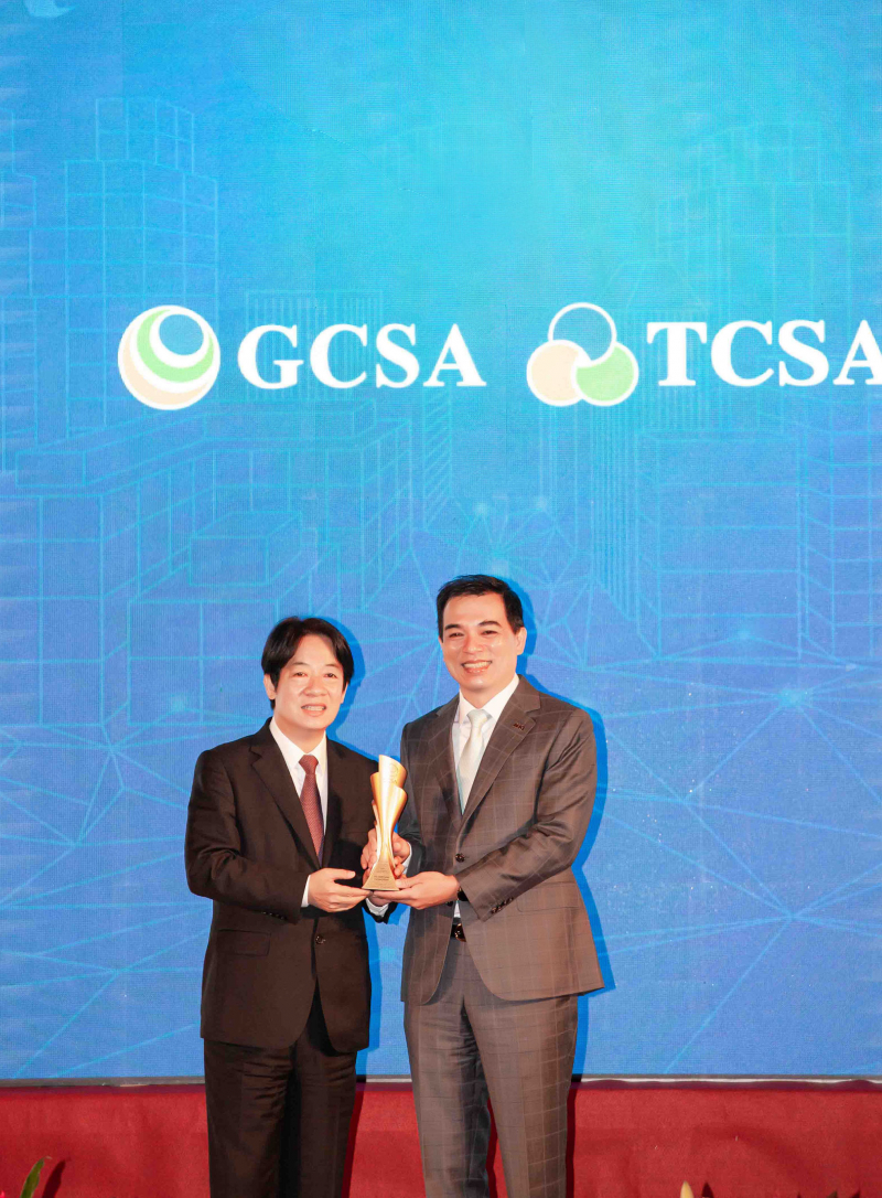 达全方位永续表现获全球永续奖及台湾永续奖肯定,由副总统赖清德颁奖 (左),好体育在线官网总经理柯富仁 (右) 代表领奖